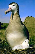 Amsterdam albatross A very large bird with a wingspan of 126 inches (3m20), weighing 15.4 pounds (7 kg). White and gray-brown plumage, gray beak with a rose-colored tip. Feeds on fish and squid. Its sole habitat is Amsterdam Island, at altitudes of around 1,640 to 1,970 feet (500-600m), on the mosses of the Plateau des Tourbières. Arrives at the end of January; reproductive couples display in early February, lay their eggs at the end of February. The male and female take turns sitting on the eggs, which hatch in May; the chicks don't leave the nest until January. The Amsterdam albatross is an endangered species, with only 120 to 150 individuals thought to exist in the world. During 1994, for example, only 6 chicks were born! Yellow nose albatross A large bird with a wingspan of 71 inches (1m80), weighing 4.4 pounds (2 kg). White and dark brown plumage, black beak with a yellow band running down the top. Favorite foods are the squid and tazard (wahoo) fish. Arrives at Amsterdam at the end of August, colonies situated on the Entrecasteaux cliffs and below Mont du Fernand. One egg is laid at the end of September and hatches 2 months later. The chicks leave around March-April. There are 37,000 couples at Amsterdam, representing 70% of the global population. Sooty albatross A large bird with a wingspan of 79 inches (2m), 5.7 pounds (2.6 kg). Black to dark-gray plumage, beak with a yellow stripe along the edge. Feeds on cephalopods, fish and crustaceans. Couples arrive on Amsterdam at the end of July, nesting high up on the cliffs of Entrecasteaux and the Mont du Fernand. One egg is laid toward the end of September, which hatches at the end of November or beginning of December. The chicks are fed every 5 or 6 days, and leave the nest at the end of May. There are 93,000 individuals worldwide, distributed between the 30th and 50th southern parallels. Subantarctic Skua A moderately large bird with a wingspan of 51 inches (1m30), 2.9 to 4 pounds (1.3 - 1.8 kg). Dark chestnut plumage with white spots. Land predator. Nests on the Plateau des Tourbières; lays an egg in October, which hatches in November. Chicks leave in January. Very few individuals at Amsterdam (roughly 25 nesting couples). Subantarctic tern